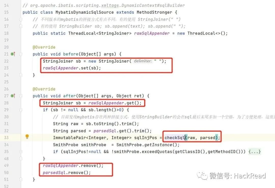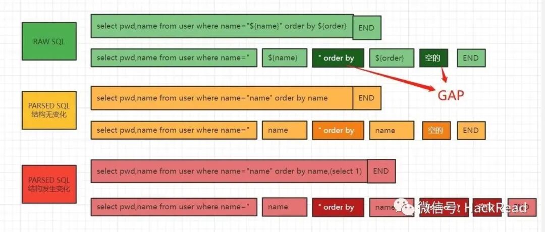 于是,我们可以有这么一个构想:获取mybatis sql执行过程中的 raw sql 与 parsed sql,判断出${}处替换后的地方sql结构有没有变化,如果sql结构发生变化则认为该sql为需要关注的,且该raw sql 单位时间内未上报过,则上报云端处理(但如果业务复杂,${}拼接的就是多个SQL词,则会误报,如开源的若依后台系统)。