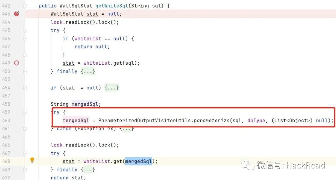 WallFilter首先会判断当前的sql语句,是否在黑名单、白名单内,如果在黑名单内则直接拦截,如在白名单内则直接放行,这一步骤可大量减少正常业务的SQL语句经过WallVisitor,提升了性能。