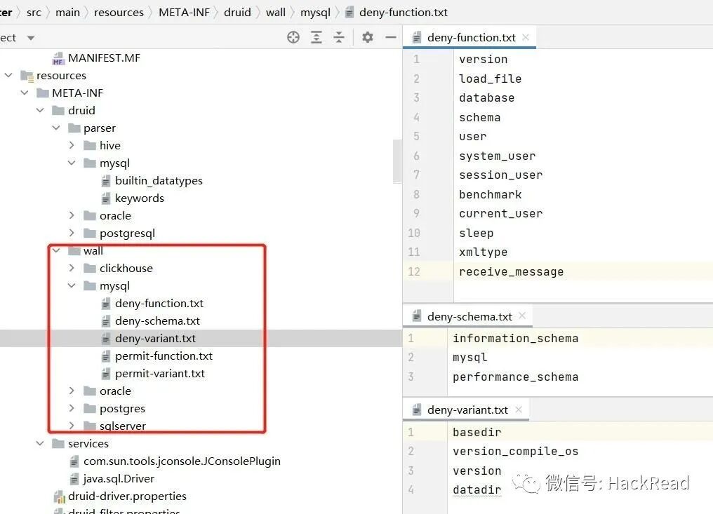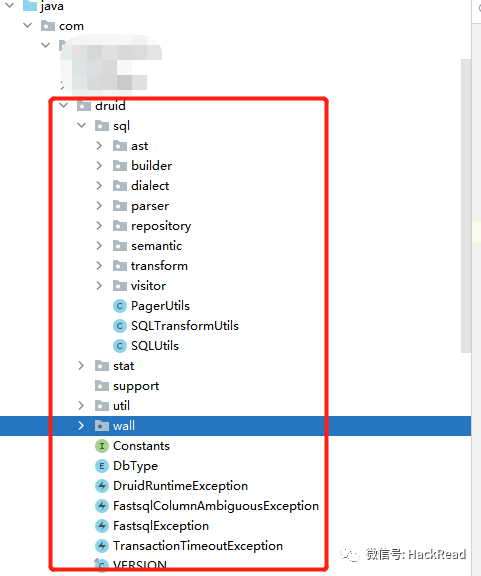 这里将druid相关代码、resource文件移植过来并重命名顶层包名,其中的 druid.wall 包含了本节 语法防火墙的重点代码 ,通过这样的移植,我们没有引入其他任何三方依赖库。
