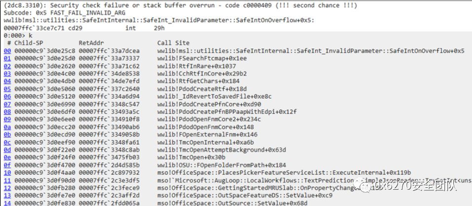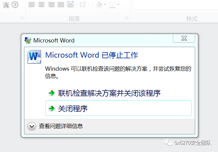 受害者打开RTF文件,RTF解析器解析恶意代码,触发堆溢出,可以看到Word产生崩溃。