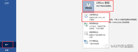 3、在“产品信息”下,选择“更新选项”>“立即更新”。注意: 如果不能立即看到“立即更新”选项,可能需要先单击“启用更新”。