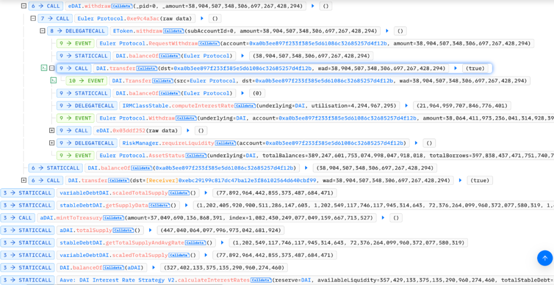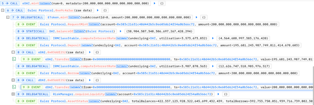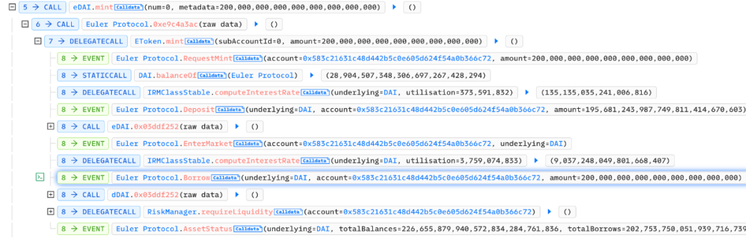 3. 之后调用 mint 函数(self borrow) 进行借款,借出了 195,681,243 枚 eDAI 和 200,000,000 枚债务代币 dDAI。