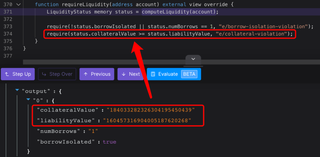 由于清算后 0xA0b3ee 账户获得的抵押品是超过债务数量的,所以能成功通过清算检查。