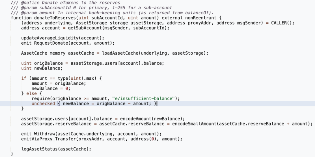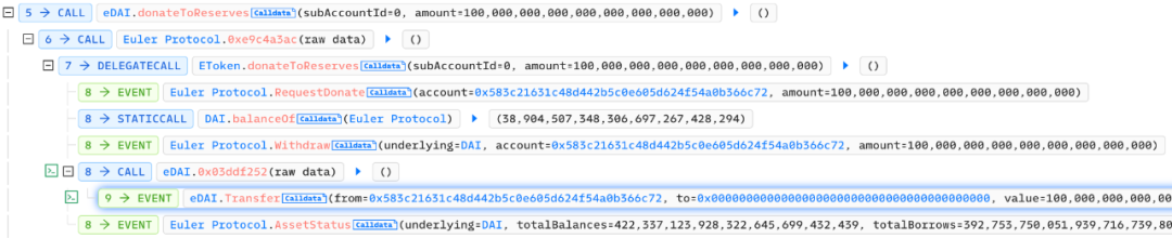 6. 然后调用 donateToReserves 函数将 100,000,000 枚 eDAI 捐赠给储备地址,此时账户中的 eDAI 剩下 310,930,612 枚,而债务代币 dDAI 有 390,000,000 枚,此刻账户处于爆仓状态,但 donateToReserves 函数并没有检查账户的健康系数。