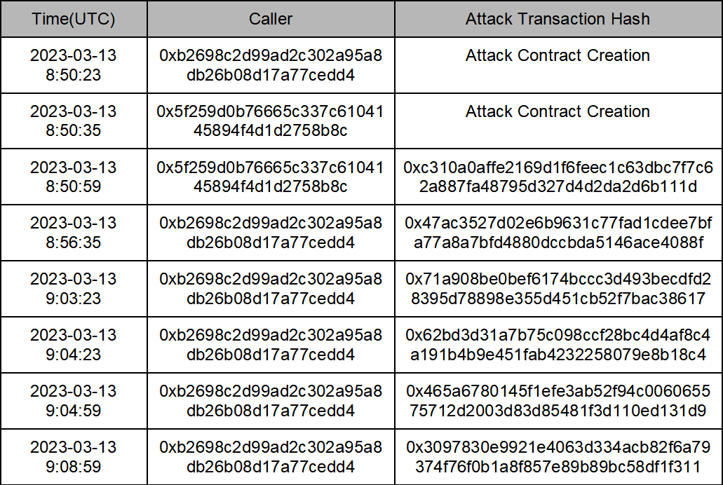 值得注意的是,此次攻击事件共有 6 笔攻击交易,除了第一笔攻击交易为攻击者 EOA 地址 1 发起的外,其他的攻击交易发起人均为攻击者 EOA 地址 2。