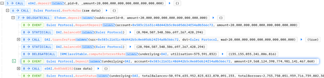2. 其次将 20,000,000 枚 DAI 通过 deposit 函数存入 Euler 中,获得了 19,568,124.3 枚抵押物凭证代币 eDAI。