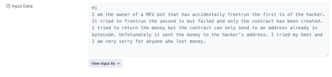 2023-03-13 12:08:35 UTC,攻击者 EOA 地址 1 发起链上喊话交易,喊话内容为:攻击者 EOA 地址 1 自称为 MEV 机器人,抢跑了攻击者 EOA 地址 2 的第一笔攻击交易,尝试抢跑其他的攻击交易但失败。更不幸的是,它创建的攻击合约只能提款到攻击者 EOA 地址 2 的获利地址。