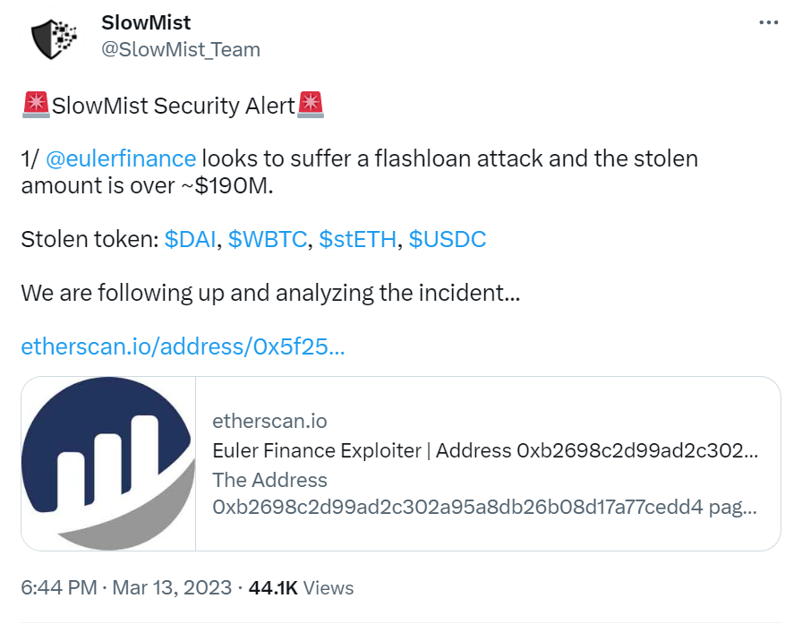 据慢雾安全团队情报,2023 年 3 月 13 日,Ethereum 链上的借贷项目 Euler Finance 遭到攻击,攻击者获利约 2 亿美元。慢雾安全团队第一时间介入分析,并将结果分享如下: