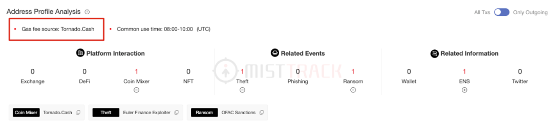 攻击者 EOA 地址 2 的手续费来源是 Tornado Cash。