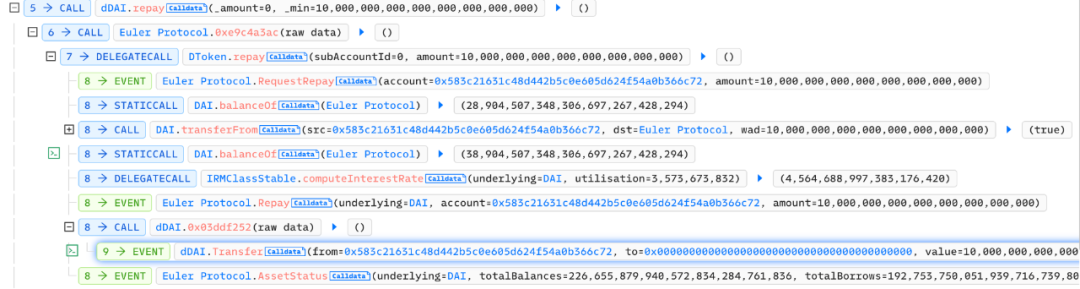 4. 紧接着调用 repay 函数用剩余的 10,000,000 枚 DAI 进行还款,其目的是为了减轻债务并增加抵押物价值,以便再次进行借贷。