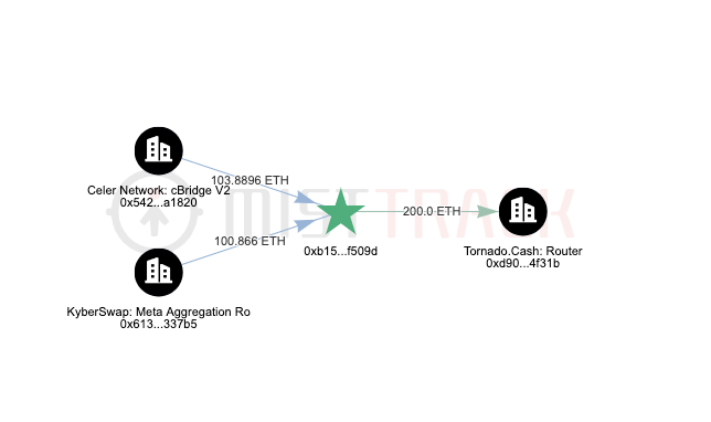 攻击获利后,EPMAX 黑客地址通过 cBridge 跨链到 ETH 链后将获利资金转移到 Tornado Cash。EPMAX 黑客使用到的平台工具有 Multichain, FixedFloat, cBridge, 1inch 和 KyberSwap。