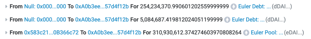 清算过程中将 0x583c21 账户的 259,319,058 枚 dDAI 的负债转移到 0xA0b3ee 上,并获取了该账户的 310,930,612 枚 eDAI。