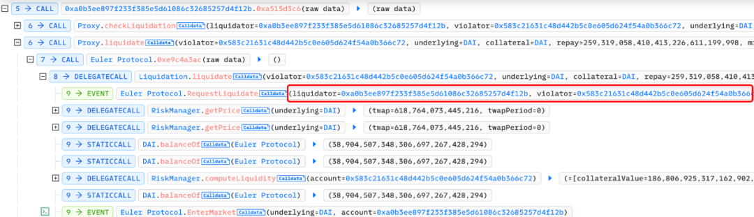 7. 通过另一个子攻击合约 0xA0b3ee 调用清算函数去清算上一步中处于可被清算状态下的账户 0x583c21。