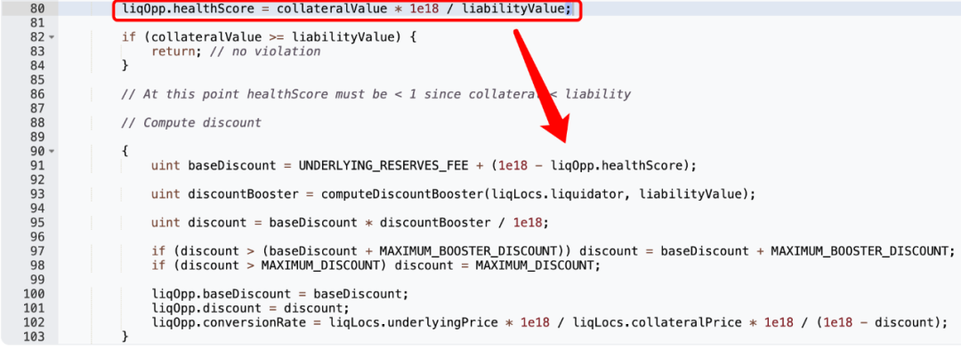 可以看出清算人仅承担较少的债务却可以获得绝大部分的抵押品,这是因为 Euler 的软清算机制:当清算人开始进行清算时,将会根据债务人的健康系数计算折扣。根据这个特性当健康系数越低时,折扣越大,所能转移抵押品越多,最终只要能覆盖本身的债务既可完成获利。