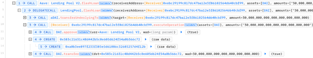 1. 攻击者首先从 Aave 中闪电贷出 30,000,000 枚 DAI,并创建了两个子攻击合约(0x583c21) 和(0xA0b3ee),为后续攻击做准备。