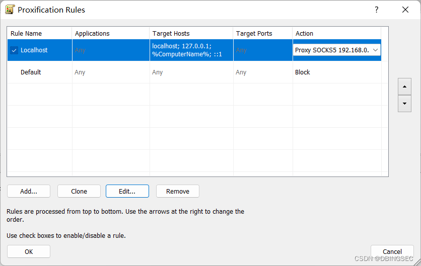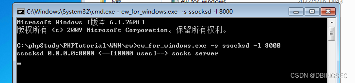 ew_for_windows.exe -s ssocksd -l 8000采用ew套接字代理,服务器上运行准备好的ew_for_windows.exe,本地使用proxifier配置如下: