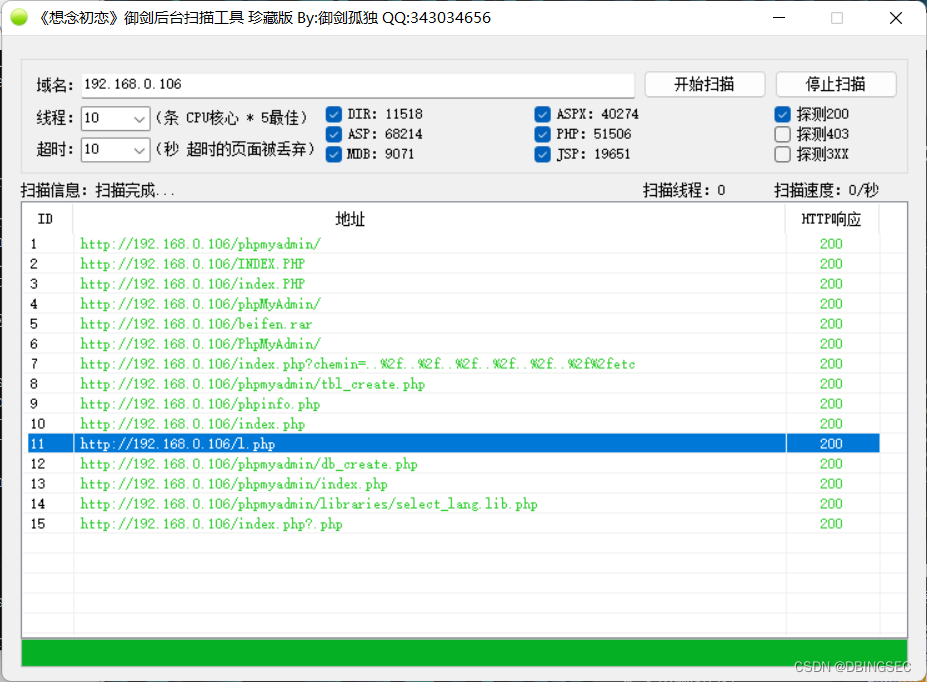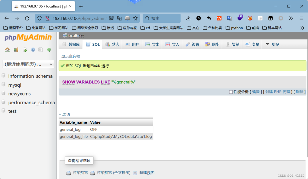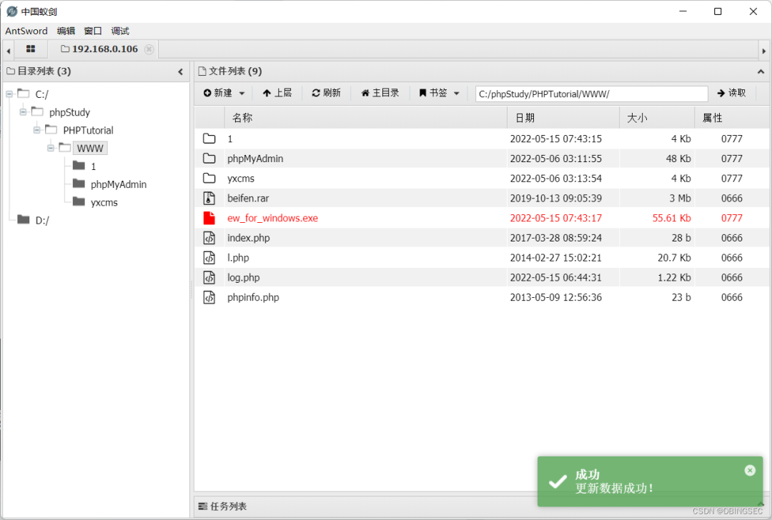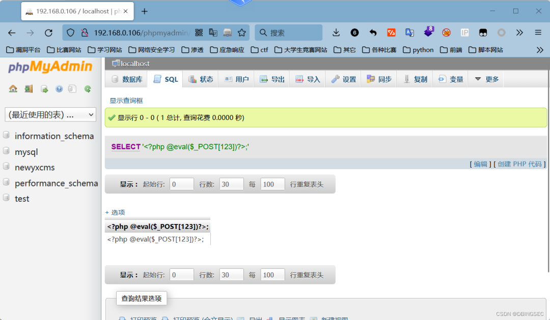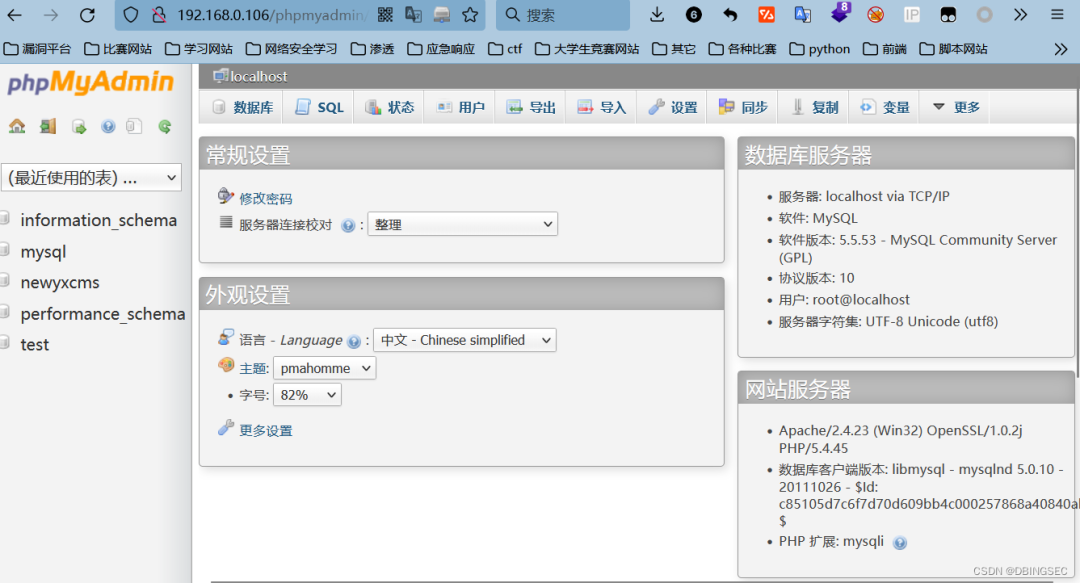 2.通过御剑扫描目录,得到敏感文件目录,其下有一个beifei.rar,phpmyadmin ,并且在192.168.0.106/phpmyadmin/ 发现数据库密码是弱口令 root root