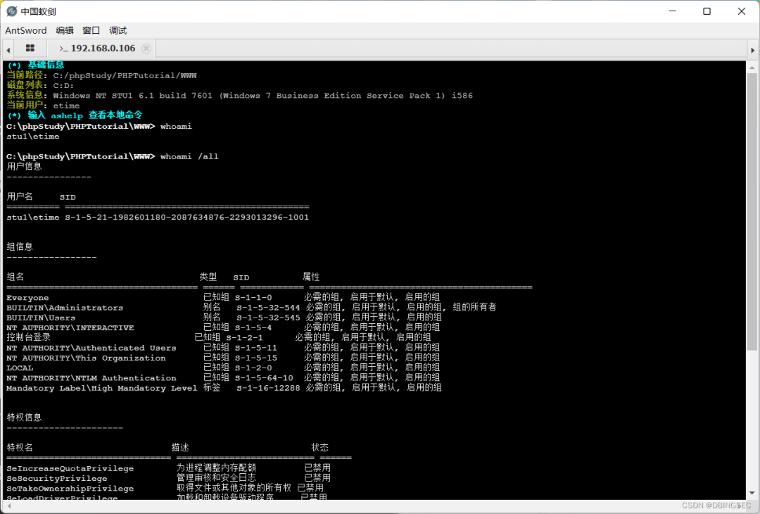 for /L %I in (1,1,254) DO @ping -w 1 -n 1 192.168.52.%I | findstr "TTL=" 探针域内存活主机whoami /all查看权限,该权限为最高管理员权限