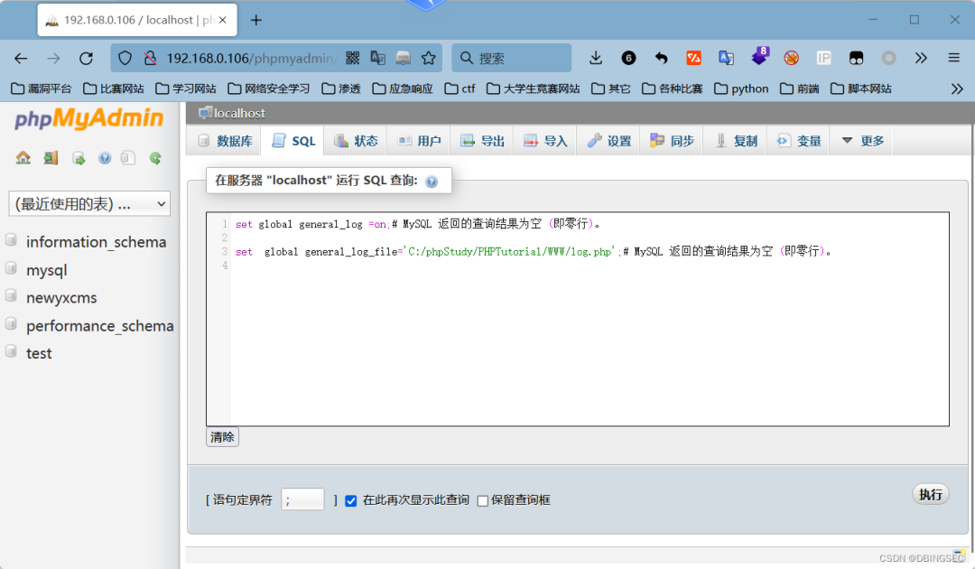 3.1.mysql允许文件导出 secure_file_priv = NULL #表示不允许 secure_file_priv = 空或者/ #表示没有限制 secure_file_priv = 具体目录 /tmp #表示只允许在/tmp目录下 secure_file_priv 只能在mysql的配置文件中修改