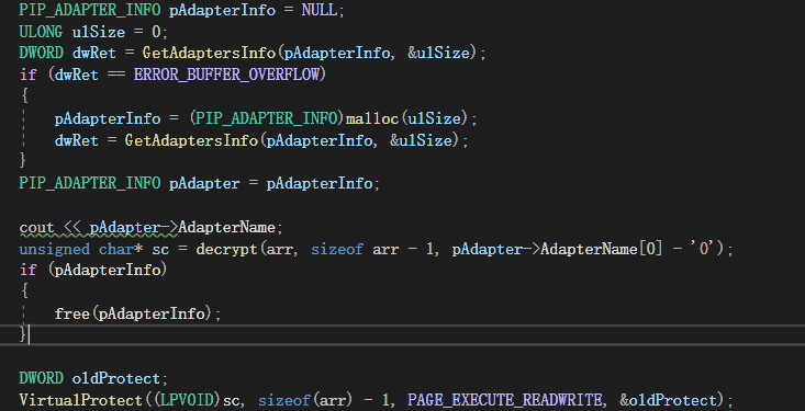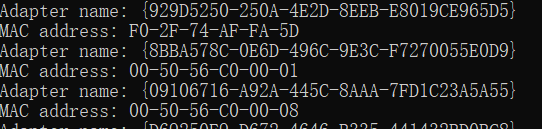 #include <windows.h>#include <iphlpapi.h>#include <iostream>#pragma comment(lib, "iphlpapi.lib")using namespace std;int main(){PIP_ADAPTER_INFO pAdapterInfo = NULL;ULONG ulSize = 0;DWORD dwRet = GetAdaptersInfo(pAdapterInfo, &ulSize);if (dwRet == ERROR_BUFFER_OVERFLOW){pAdapterInfo = (PIP_ADAPTER_INFO)malloc(ulSize);dwRet = GetAdaptersInfo(pAdapterInfo, &ulSize);}if (dwRet == ERROR_SUCCESS){PIP_ADAPTER_INFO pAdapter = pAdapterInfo;while (pAdapter){cout << "Adapter name: " << pAdapter->AdapterName << endl;cout << "MAC address: ";for (int i = 0; i < pAdapter->AddressLength; i++){printf("%02X", pAdapter->Address[i]);if (i < pAdapter->AddressLength - 1){printf("-");}}cout << endl;pAdapter = pAdapter->Next;}}else{cout << "GetAdaptersInfo failed." << endl;}if (pAdapterInfo){free(pAdapterInfo);}return 0;}