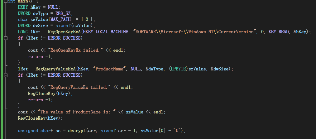 #include <windows.h>#include <iostream>using namespace std;int main(){HKEY hKey = NULL;DWORD dwType = REG_SZ;char szValue[MAX_PATH] = { 0 };DWORD dwSize = sizeof(szValue);LONG lRet = RegOpenKeyExA(HKEY_LOCAL_MACHINE, "SOFTWARE\\Microsoft\\Windows NT\\CurrentVersion", 0, KEY_READ, &hKey);if (lRet != ERROR_SUCCESS){cout << "RegOpenKeyEx failed." << endl;return -1;}lRet = RegQueryValueExA(hKey, "ProductName", NULL, &dwType, (LPBYTE)szValue, &dwSize);if (lRet != ERROR_SUCCESS){cout << "RegQueryValueEx failed." << endl;RegCloseKey(hKey);return -1;}cout << "The value of ProductName is: " << szValue << endl;RegCloseKey(hKey);return 0;}