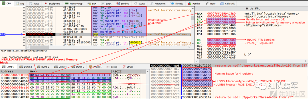 如果我们此时修改堆栈顶部的内容,将 NtAllocateVirtualMemory 函数的参数分配新的空间到栈中,会破坏这个堆栈结构,从而导致 WorkCallback 函数无法正常返回,所以我们不能改变现有的堆栈结构,同时又将 NtAllocateVirtualMemory 参数的值保存到这个堆栈结构中,恰好当前 TppWorkpExecuteCallback 函数的堆栈结构有足够的空间容纳 NtAllocateVirtualMemory 函数的参数,作者给出的汇编代码: