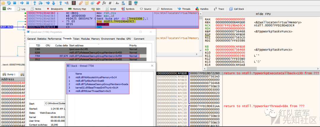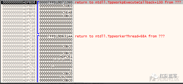 在之前处理 LoadLibraryA 函数时,为了能够构造 PTP_WORK_CALLBACK 类型的函数结构并将正确的参数传递给 LoadLibraryA 函数,我们编写了一些汇编代码将 RDX 寄存器中的存储的参数转移到了 RCX 寄存器中,而此处的 NtAllocateVirtualMemory 函数有6个参数,这些参数在传递时不仅使用了寄存器,还需要使用堆栈进行传参。我们的 WorkCallback 本质上是通过另一个函数 TppWorkpExecuteCallback 进行调用的,此时的堆栈顶部会保存该函数的返回地址: