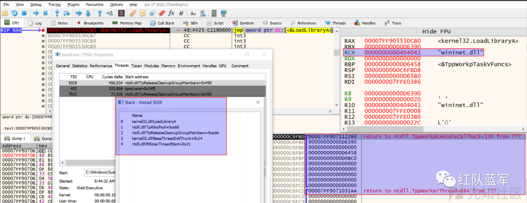 LoadLibraryA -> TpPostWork -> RtlUserThreadStart