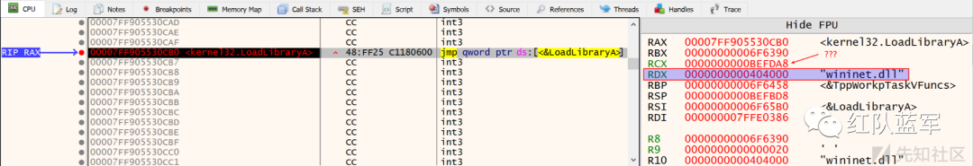 这会导致参数无法正确地传递给 LoadLibraryA,如下,wininet.dll 被赋值给了 RDX 寄存器,在x64架构中,RDX 被用作函数传参时的第二个参数,然而,LoadLibraryA 函数并没有第二个参数!