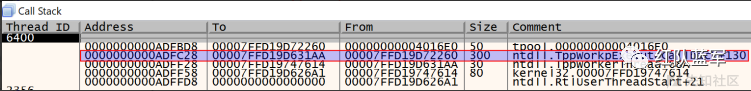 其中的第二个参数即是一个函数指针,假如我们将该参数替换成指向 LoadLibraryA 函数的指针,那么函数 LoadLibraryA 就会作为一个回调函数传递给 TpAllocWork,而后通过调用 TpPostWork 来创建一个新的线程执行 TpAllocWork 中的保存的回调函数,此时,LoadLibraryA 函数的返回地址会指向 TpPostWork 函数。理想的函数返回情况如下: