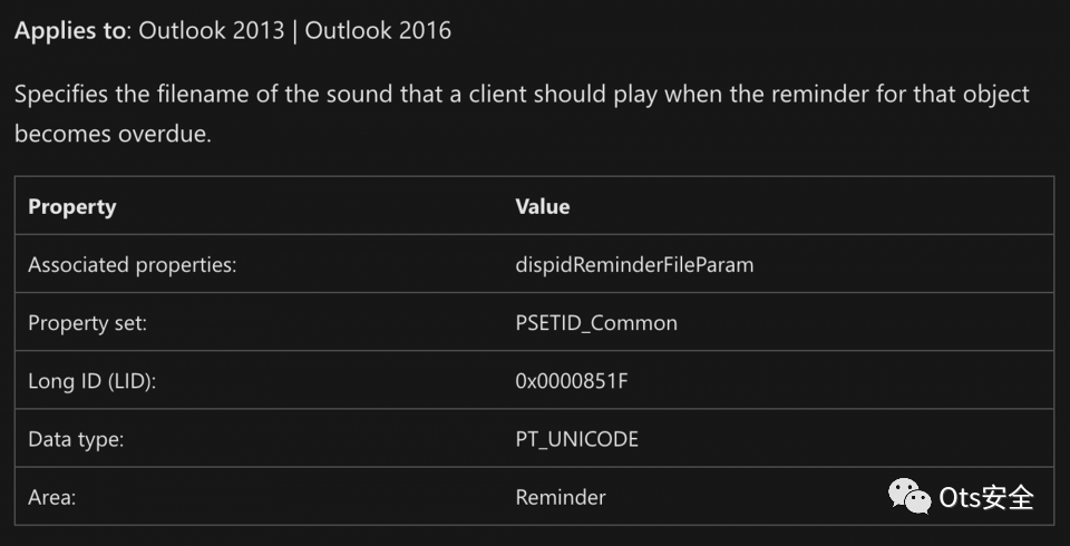 此属性控制在触发邮件项提醒时 Outlook 客户端应播放的文件名。这当然特别有趣,因为它暗示该属性接受一个文件名,该文件名可能是一个 UNC 路径,以便触发 NTLM 身份验证。