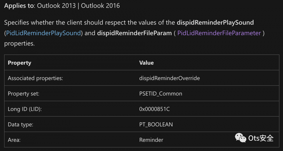 在进一步分析可用属性之后,我们还注意到PidLidReminderOverride属性,其描述如下: