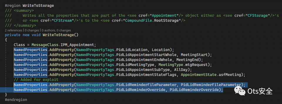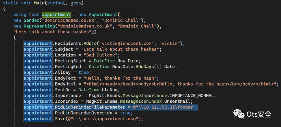 为了创建我们的恶意日历约会,我扩展了 Appointment 类以添加所需的PidLidReminderOverride和PidLidReminderFileParameter属性,如上所示。