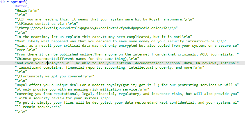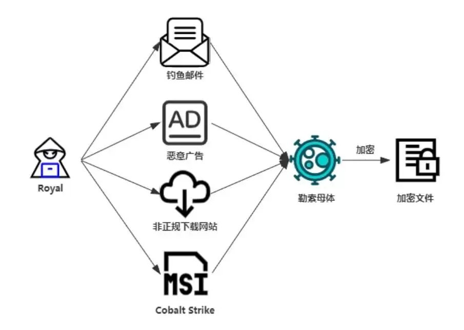 Royal 勒索软件于2022年1月首次被观察到,之后因为多次攻击医疗保健行业被相关媒体和企业大量通报。相比同期相对活跃的勒索家族,该组织并不提供流行的RaaS(勒索软件即服务)模式,而是由一群经验丰富的勒索人员组成的私人团体。该勒索软件最初使用采用 Black Cat 的加密器,随着人员的不断扩充和软件的不断完善,推出自己的加密器 zeon,并且于2022年9月正式更名为 Royal。