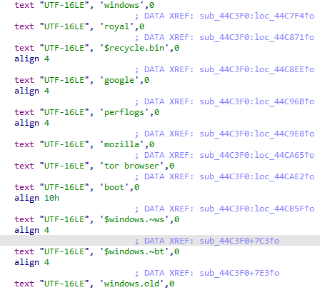 为了防止数据重复加密或者加密后系统不能运行,也为了提高加密的运行效率和速度,该加密软件会排除扩展名,如 exe\dll\bat\lnk\royal_w\royal_u\README.TXT。