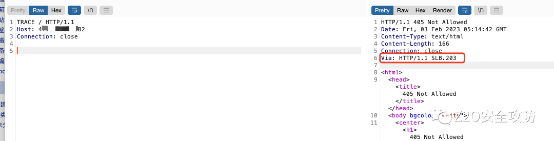 即使现在的trace方法都已经被禁止了,但是响应包中还是会通过via字段来进行显示,所以可以通过判断Via字段或者是X-Via来判断是否是代理服务器,比如下面就是通过slb负载均衡来进行反向代理的服务器