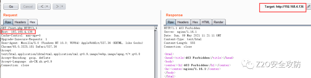 挖掘zpchcbd.com的域名的漏洞,发现收集的域名其中DNS解析的一个IP为192.168.4.136(假设外网IP),直接访问192.168.4.136却是回显为nginx 403拒绝访问的界面