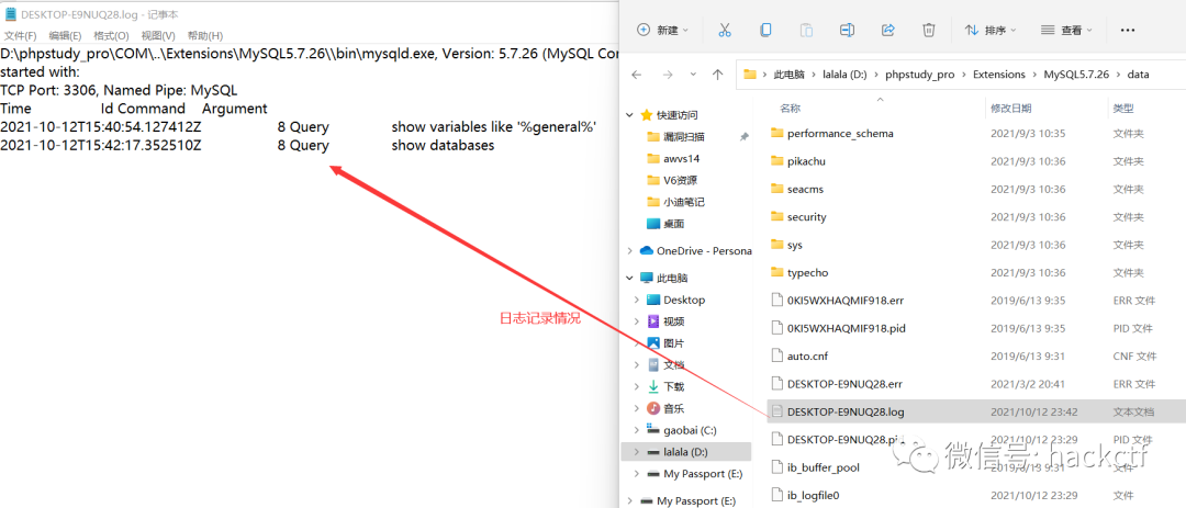 2.mysql.ini添加配置项开启日志:log=D:\phpstudy_pro\Extensions\MySQL5.7.26\data\mysql_log.txt