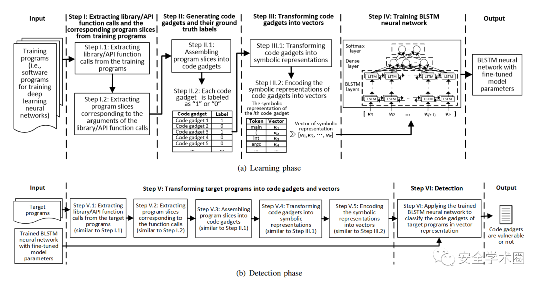 下面是整个系统架构,有两个阶段:学习阶段和检测阶段。学习阶段的输入是大量的训练程序,其中一些包含一个或多个已知漏洞的,另一些则不是。学习阶段的输出是漏洞模式,被编码到 BLSTM 神经网络中。