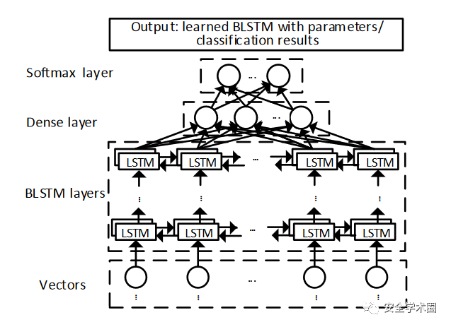 上图是 BLSTM 神经网络的结构,具有多个 BLSTM 层、一个密集层和一个 softmax 层。输入是向量;BLSTM 层有前向和后向两个方向。BLSTM 层包含一些复杂的 LSTM 单元,作者将其视为黑盒;密集层减少来自 BLSTM 层向量的维数;softmax层将从密集层接收到的低维向量作为输入,负责表示和格式化分类结果,为学习阶段(VulDeePecker的其中一个阶段)的神经网络参数更新提供反馈。学习阶段的输出是模型参数微调的BLSTM神经网络,检测阶段的输出是分类结果。
