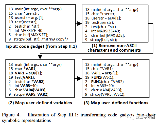 此步骤旨在启发式地捕获程序中的一些语义信息以训练神经网络。首先,删除非 ASCII 字符和注释;其次,将用户定义的变量以一对一的方式映射到符号名称(例如,“VAR1”、“VAR2”);最后,将用户定义的函数以一对一的方式映射到符号名称(例如,“FUN1”、“FUN2”)。注意当多个函数出现在不同的code gadget中时,可能会映射到相同的符号名称。如下图展示了此过程。