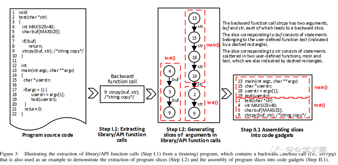 上图(原文中为图3,在下文中也称为图三)显示了后向library/API 函数调用 strcpy(第 9 行)的示例,由于它不直接接收任何外部输入,所以是一个后向的library/API 函数调用。