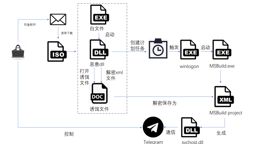 近期,研究人员在日常威胁狩猎中发现Saaiwc组织针对印度尼西亚外交部等政府部门的多个网络攻击活动。在本轮攻击活动中,该组织利用磁盘映像文件作为恶意载体,诱导执行后解密释放MSBuild Project文件,随后利用计划任务触发winlogon注册表以启动MSBuild.exe工具生成并加载恶意载荷,从而完成窃密行动。