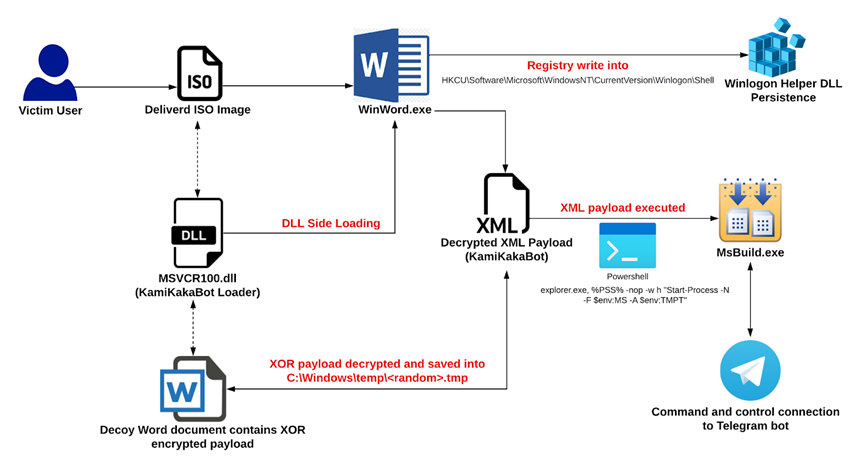 使用了相同的恶意软件交付和执行技术(如使用ISO映像文件附件传播KamiKakaBot,并利用Winword.exe执行DLL侧加载)。主要的区别则在于恶意软件的混淆程序得到改进,可以更好地规避反恶意软件措施。例如,攻击者使用了Living-off-the-Land二进制文件 (LOLBIN),实现在受害者的设备上运行KamiKakaBot。